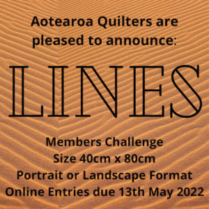 As I write this month’s VP’s piece, I’m sitting in Rotorua airport (mask firmly in place) after our two-day AQ committee face to face meeting.Zoom meetings are wonderful and have really enabled us to keep our meetings regular and vibrant whilst also keeping costs down, but we endeavour to meet face to face once or twice a year for an intensive planning session. It is very productive and easier to brainstorm and discuss when everyone is in the same room! We have put together an exciting program for 2022 and even begun planning for the Great NZ Quilt Show in 2023.One of our decisions that we can announce is the theme of the next members challenge. LINES is our topic and now I am seeing linear compositions or lined surfaces everywhere. Powerlines, fence lines, tiled surfaces, queues or lines of people….and not least, my own smile lines! Look for more challenge details further along in the newsletter.We also have plans to grow and foster our regional AQ members (RAQM) groups. A RAQM group is a group of AQ members that meets regularly under the AQ ‘banner’. You don’t have to have any sort of committee or formal structure, but you do have to all be current members of AQ. You also need to be meeting regularly, we suggest every couple of months, and with meetings specifically designated as RAQM group meetings.If you think you already have a RAQM group, please give one of the committee a call – Heather Craig is our South Island rep and Jo Hollings our North Island rep – and have a chat. And if you would like to establish a RAQM group in your area, they would also love to hear from you. We would like to offer any support we can.As 2021 winds to a close, we look forward to sharing 2022 with you.Happy stitching everyone and see you at the Christmas zoom meeting!Charlotte Scott, Vice President